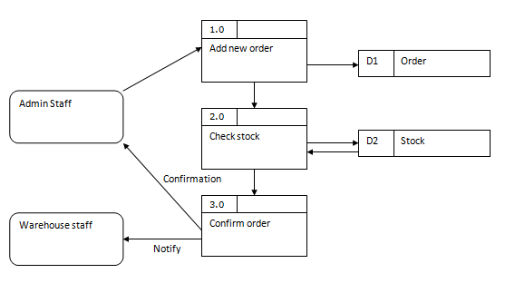 External entities represent anything from outside the system to be modeled. This tends to be some form of human input but could be anything such as a sensor or another separate system. Sometimes other external entities need to be involved in a data flow and these should be represented on the diagram, such as letting the warehouse staff know that a new order has been made. Internal process are where something is done with the input given. Add new order, for example, will save the order to the database as well as possibly validating the input. All processing which occurs will tend to happen in a internal process. A data store represents the database or anything else we can store data in such as a file. It is common on DFDs to only put return arrows if data, other than if the transaction was successful, is returned. The flow of data is shown via arrows. You can add a label to the arrow if you wish to express something such as the type or nature of the data to flow. If the flow is obvious then it is better to leave it blank so the diagram does not become cluttered.