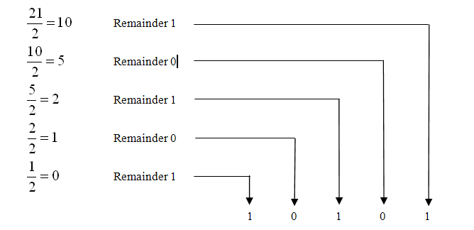 128 + 32 + 2 + 1 = 163 Looking at a simpler example, convert 21. The above diagram shows exactly where each of the bits end up in the final answer of 10101. The remainder of the first division will end up being the right most digit.