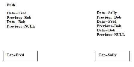 Each element of the stack, which we call nodes from now on, has a link to the previous node. With all of this information we can now define pseudo code on how to push and pop nodes to the stack. The diagram on the left shows the situation before while the one on the right shows the situation after a push occurs. The important thing to notice is what happens to the links. The node added, Sally, will initially have no previous set, so it will be NULL. What happens then is the link to the top, which is Fred, is copied into the new nodes previous. The top link then becomes the node you have just added. So the sequence of events are -