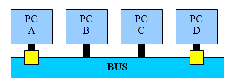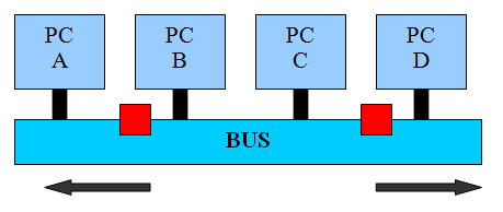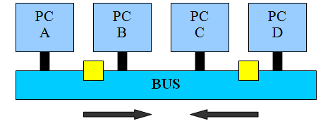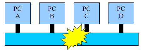 When two PC's transmit onto a bus at the same time there is a likely chance that they will collide. When packets collide on a network bus there is no explosion or crashing sound. However the packets which have collided will be corrupted. The packets will not be destroyed in the strictest sense of the word but they will be corrupted beyond recognition. The electronic signals which represent the packet will continue to travel along the cable. It is this fact which enables the network to detect the collision. Although the exact mechanics of collision detection is beyond the scope of this course it is important to understand how a collision can occur and the consequences of the collision. The diagram below shows a typical collision. PC A and PC B both place packets on the network. Both packets travel down the bus towards one another. The arrows show the direction the packets are traveling in. Both packets have met in the middle and caused a collision. The data is now corrupted and can no longer be used. The corrupted packets then travel on down the bus. The collision will be detected and the packets resent after a random amount of time. |