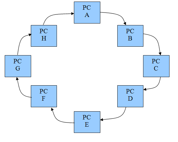 PC's are formed into a logical ring with each PC connected to at least two other PC's. The ring is a closed system and is shown in the diagram below. It is important to realize that the PC's do not have to be physically placed around in a ring. It is how they are connected which leads to the ring not there actual physical positions. A bus network can send a packet in either direction (or both!) whilst a ring network the packet will only travel in one direction. The direction that the packet travels is shown on the diagram below. Ring networks benefit from the fact that there are no collisions which will occur on the network. As packets only go one way around the network then there will be no situation where two packets are traveling towards one another. Also when a packet arrives at its destination it is removed from the network, so will no longer travel around the ring. If the packet was a broadcast packet, that is meant for all PC's, then it would be the sender who removes the packet. In fact if the packet is incorrectly addressed then the sender can remove the packet from the network and will also know that there is a issue with the sending of that packet. In order for a ring network to work it is necessary that only one PC transmits packets at a given time. This is done by using a token which is passed around from PC to PC. A PC can only send data when it has the token. Once it has finished, or it has held the token for a given amount of time, then the token is passed on. That way every PC will get a chance to send packets at some point. When the token arrives at a PC which does not need to send any packets then it will simply just pass the token on. This is known as a token ring network, Advantages