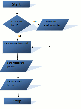 The diagram is fairly simple but covers a lot of the main points. It shows how a the stock control part of an order may occur. First of all stock is checked to see if stock is low (not that stock exists). The idea being that if there is low stock then you will preempt running out by ordering early. This requires input to say what the current stock level is. Notice that it is a Boolean question, or a yes/no question. This means the analyst must provide both paths in order for it to be complete.
