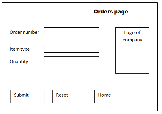 Order number- This is where the order number will be entered. It will only allow numbers and has a max size of 5 characters. No negative numbers allowed. Item type- This allows free text up to character length 40. When the user enters the first 3 letters it will attempt to predict what the product will be and give some possibilities. The user can then use the arrow keys and enter to select from the possibilities. They can also enter it manually if they wish. Quantity - This allows a number to be entered of max value of 100. No negative numbers allowed. Submit - This will send off the information to be stored to the database. If there is any problems form the database (as defined in the save order requirement) then the user is sent to the error screen (see section x) Reset- This will clear all text on the page. A combo box will be displayed with the message "Are you sure?". Home- This will take the user to section x. If any information has been entered then a combo box will appear saying"Navigating away from this page will loose any unsaved work. Are you sure?". The screen design is fairly straight forward. Notice that the exact colours have not been defined in this example. This is normal practice as the graphical style tends to be defined by the customers brand. However the exact colours and font can be added to the design. What is key to the design is what each section contains. Also the validation and the functionality.