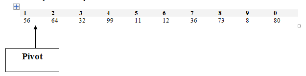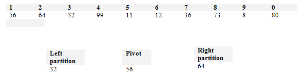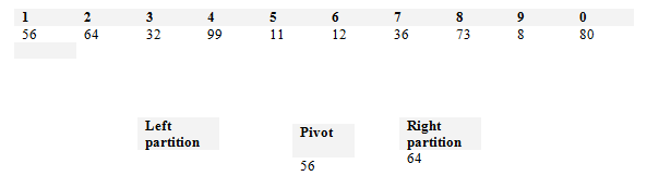 The first element of the list will become the pivot. Step 2 - Order all elements of the partition You must pass over all of the numbers in the list. Any number less than the pivot should be placed on the left partition while all numbers greater of equal to the pivot should be placed on the right.