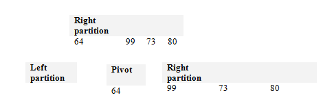 There is nothing to sort on the left hand partition (remember that you always work on the left partition first). 64 is now sorted so we look again at the right hand partition. The pivot will be 99 so our left hand partition will contain 73 and 80 while the right hand partition will contain nothing. Finally the left hand partition will be considered and basically left alone as there is nothing left to move. The final result is -
