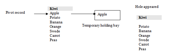 The pivot record is placed into a temporary holding bay which produces a hole in the list. The next step is to insert the record into the sorted sub-list. The record in the temporary holding bay is compared to the first record in the sub-list. If it is less than that record then that record and all other records below it in the sorted sub-list are shifted down by one.