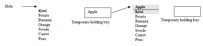 Banana is less than kiwi, as such the sub-list must be shifted down. Potato is moved into the hole leaving a hole in its place. Kiwi is then moved into this new hole leaving a hole for banana to go in. This goes on until the last record is inserted. The further through the algorithm we the larger the sorted sub-list becomes. So by the time all records have been considered the whole list would be sorted. |
