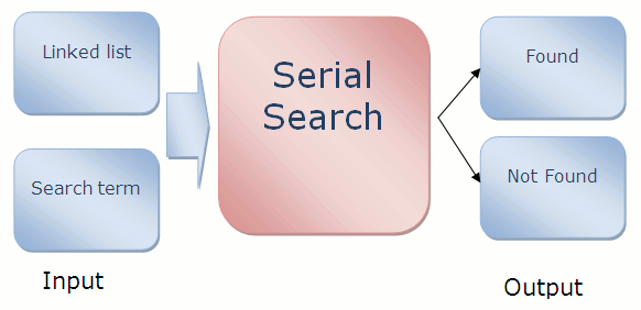 One of the main algorithms which can be applied to linked lists, or to arrays, is a serial search. It is the most simple search possible but gives a nice introduction to how searches work. Putting it simply you will two things when doing a serial search; the linked list (or array) and the item you are searching for. There are two possible outcomes; either it finds it or it does not. This can be modeled by an input/output diagram.