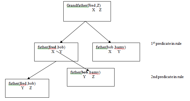 hairyMale(X):- male(X), hairy(X). This rule tells us who is both hairy and a male. The hairyMale() predicate has a single atom. This is the predicate which the rule will be called. The single atom is a variable. We use a variable here as we want to see which males are hairy. After the predicate there is a :- which simply indicates that this is a rule. Inside the rule are two predicates. The first one is ended with a comma and the second one is ended with a full stop. The full stop says that the rule is ended and the comma says that there are more predicates to follow. Notice that both male and hairy both use the same variable. Let's say we typed the following into the interpreter - hairyMale(bob). What the interpreter will now do is replace the X in hairyMale with the value bob. It will then do a search to see if a fact exists for male(bob) and hairy(bob). As they both exist the result should produce the answer Yes. If we did a search for hairyMale(fred) it should return the answer No. Finally if we did the search hairyMale(Z) it should return the answer Z = bob. The last answer is interesting as what the interpreter has done is find all hairy males. As such it tries all of the male facts and all of the hairy facts and tries to combine them, illuminating the answers it can not use and reporting the correct answers. It uses a mechanism called backtracking in order to accomplish this. Backtracking will be looked at later in some detail. grandfather(X,Z) :- father(X,Y), father(Y,Z). Going back to the above rule we can see there are three variables X - The grandsons name Y - The fathers name Z - The grandfathers name The best way to understand this is to work through a typical query. Here is a typical query and its result. We use the variable Z so it will return the persons grandfather. As such we start off with grandfather(fred,Z). The next step is to start matching the fathers. As there are only two fathers it only has two initially to consider.