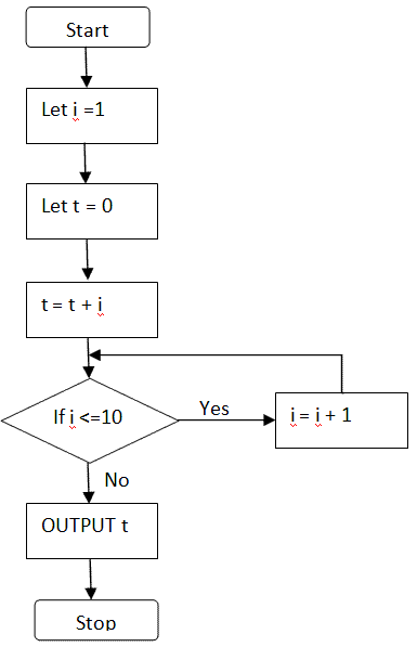 The above symbols are used in a flowchart. There are others but these are the main ones. A flowchart is a classic way of representing problems in a serial manner. It allows selection through decision boxes, itteration using feedback lines and access to variables through the process box. Input is handled by the input box. The diagram below shows a simple algorithim which adds up the numbers 1 to 10 and outputs the result.