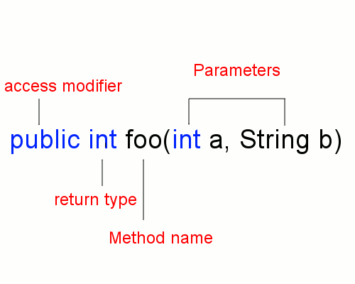 Access modifier - This can be default, private or public. Public methods can be accessed by anything, default (you do not write default, just leave it blank) and private only accessed by the class.